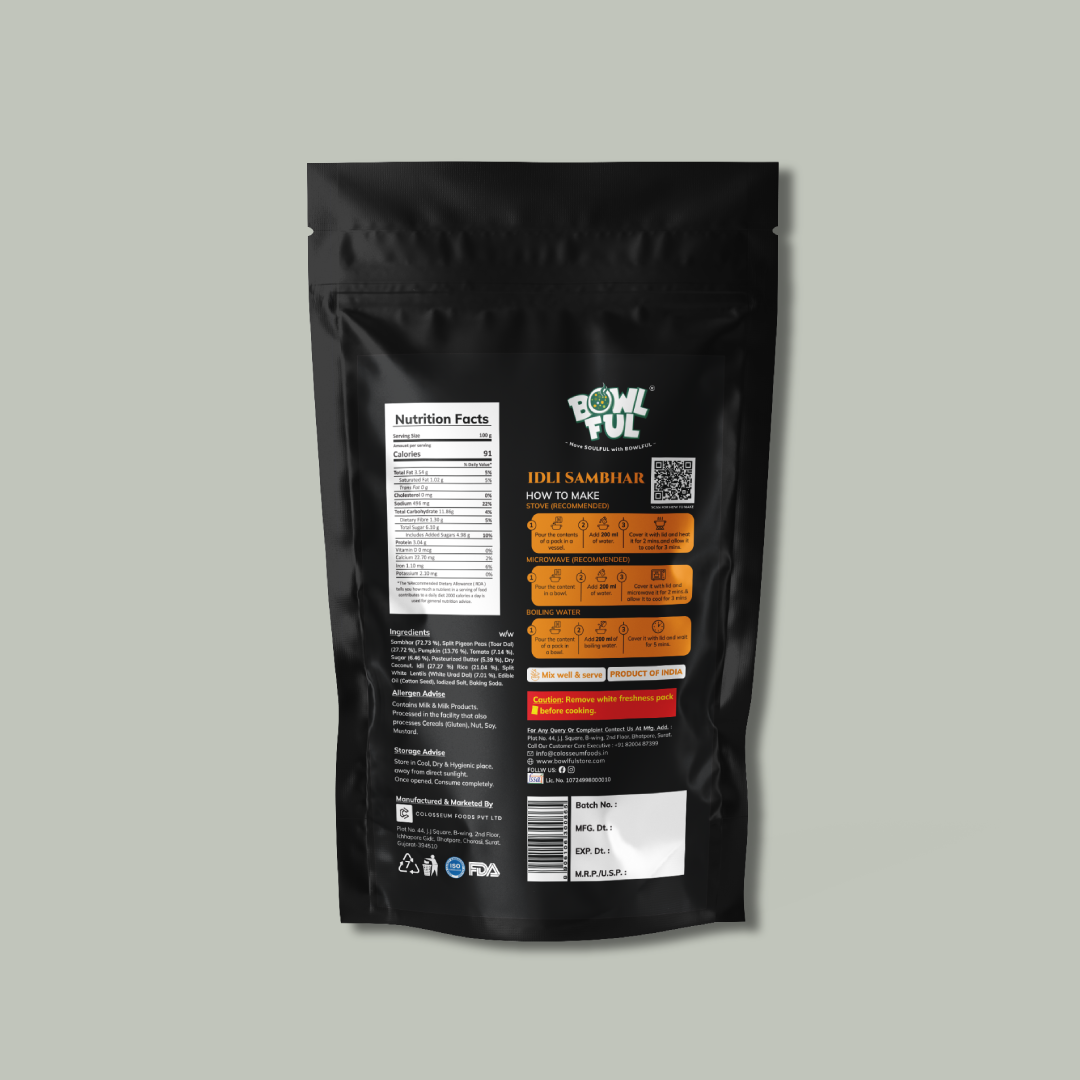 Ingredients: Sambhar : Pigeon Peas (30.27), Pumpkin (7%), Tomato (8.5%), Coconut, Split Chick Peas, Tamarind , White Gram, Curry Leaves, hydrogenated vegetable oil, Salt, Spices & Condiments Idali : Rice Flour, White Urad Flour , Salt .