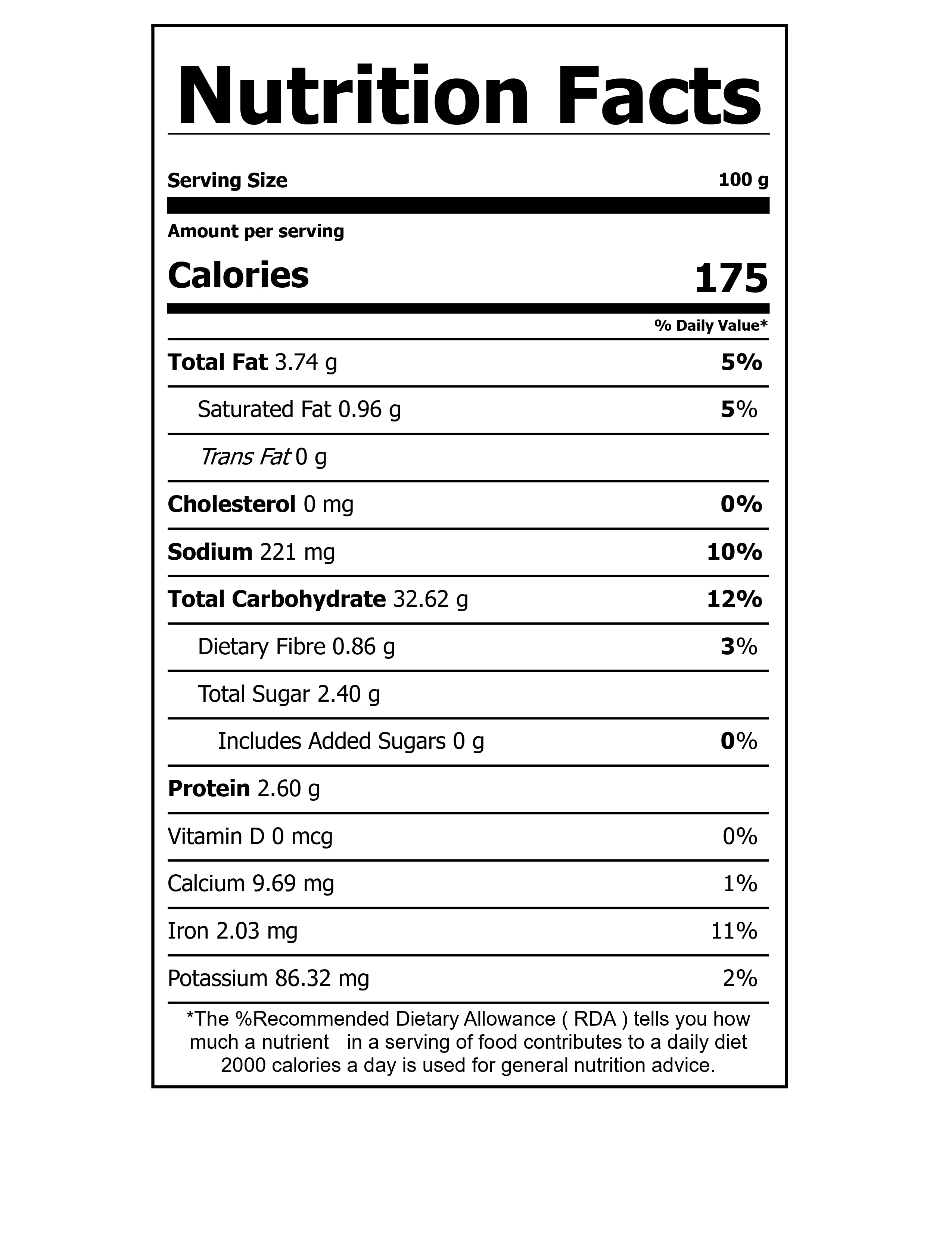 Ingredients: Flattened Rice (73.07), Edible Oil (Cotton Seed) (9.91), Sugar (7.76), Iodized Salt (5.29), Green Chilli, Lemon, Cumin, Mustard Seed, Turmeric, Curry Leaves, Asafoetida.