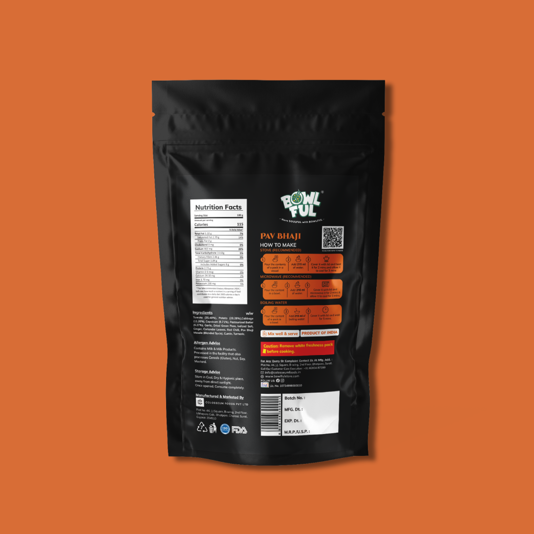 Ingredients: Tomato (32.32), Potato (23.33), Cabbage (7.57), Capsicum (7.40), Butter (7.10), Green Peas (7.06), Red Chill (6.33), Garlic, Ginger, Salt, Red Chilli Powder, Coriander Leaves, Pav Bhaji Masala, Cumin, Turmeric Powder.