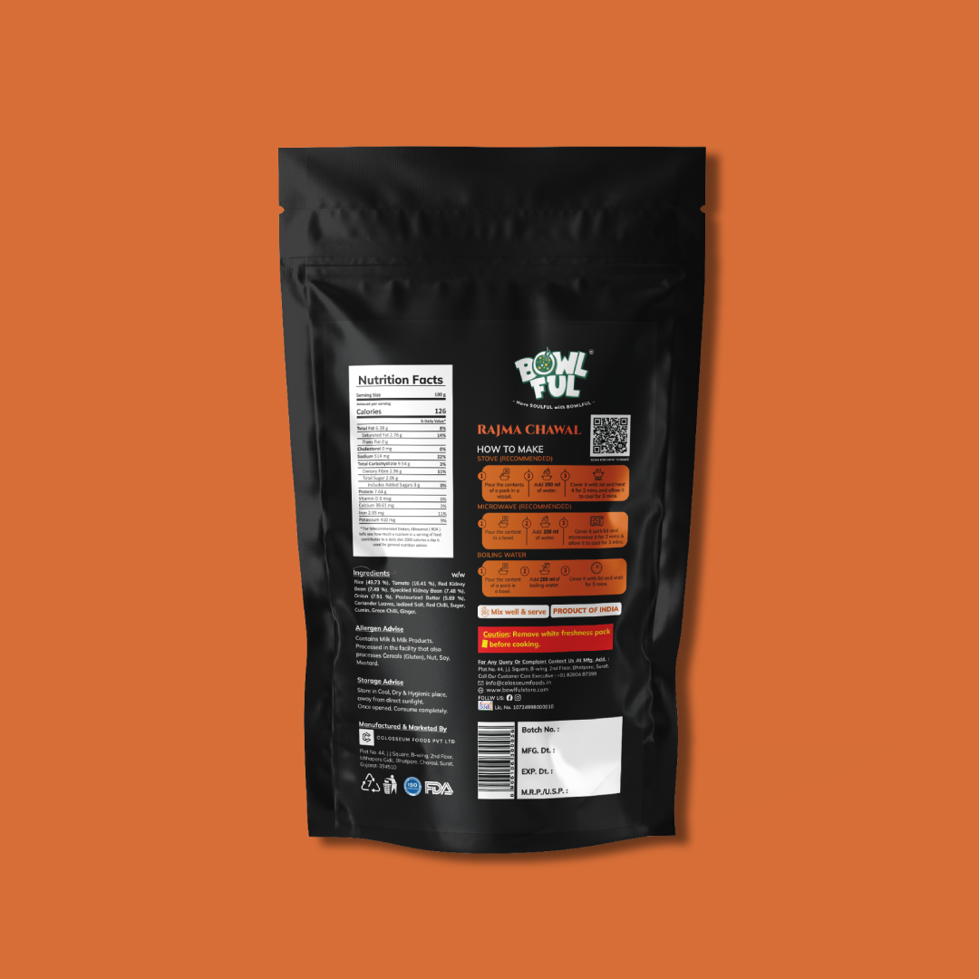 Ingredients: Rice (45.32), Red kidney bean (37.73), Tomato (8.92), Butter, Onion, Salt, Coriander, Red Chilli Powder, Sugar, Chilli, Cumin, Garlic, Coriander Powder, Rajma masala, Fenugreek seeds, Garam masala, Cinnamon, Green Cardamom, Turmeric Powder, Bay Leaf.