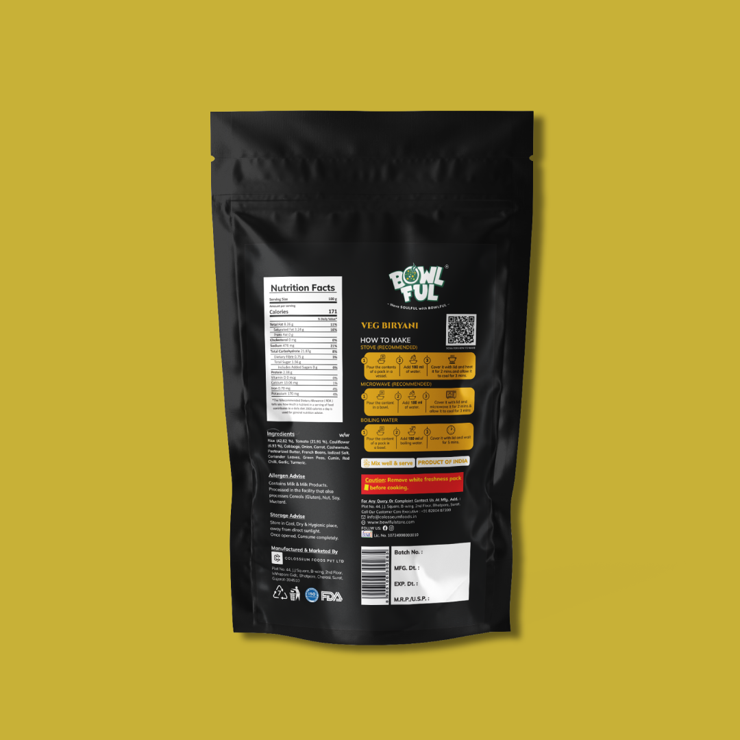 Ingredients: Butter (55.00), Biryani Grevy (12.05), Cashew (7.73), Tomato (5.02), Cabbage, Cauliflower, Beans, Carrot, Onion, Green Peas, Coriander, Salt, Biryani Masala, Rose Water, Red Chilli Powder, pandan leaf extract. Kichan King Masala, CuminChat Masala, Turmeric Powder, Chole Masala, Garam Masala, Ginger, Green Cardamom, Cinnamon, Clove, Bay Leaf, Turmeric Powder, Green Chilli, Peanuts.